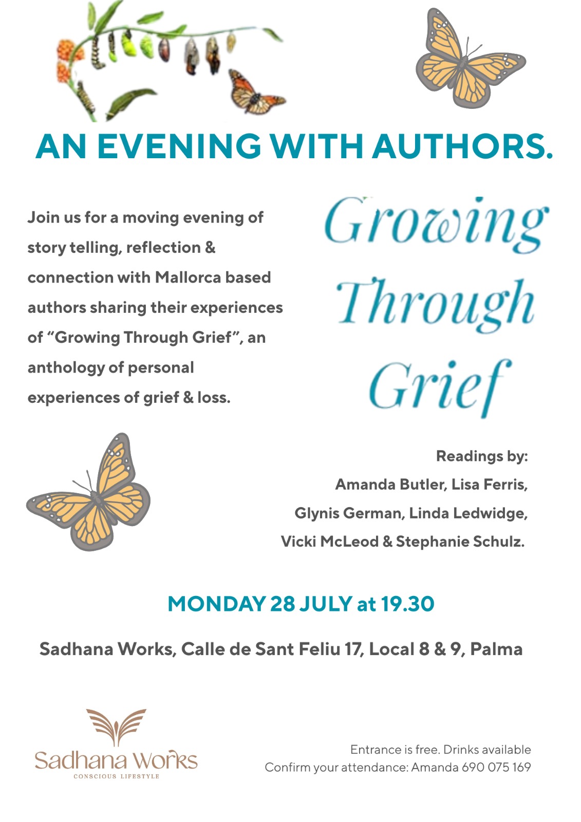 Join us for a moving evening of story telling, reflection and connection with five Mallorca based authors sharing their experiences of “Growing Through Grief”, an anthology of personal experiences of grief and loss.
